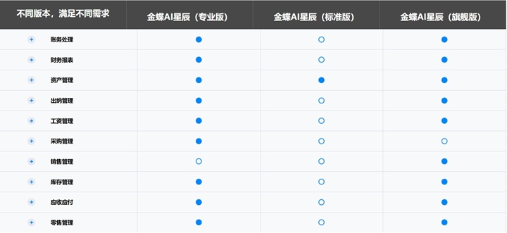 金蝶AI星辰各版本功能對比