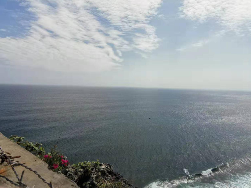 午餐后,去了烏魯瓦圖斷崖(情人崖)。這里海浪拍打著懸崖,海鳥在空中翱翔,景色非常迷人。與海神廟岸邊公園相似,情人崖上也遍布各種帶有宗教色彩和巴厘島特色的石雕,這些雕塑造型圓潤,線條卻無比繁復(fù),足可見出工匠的巧手妙思。更有熱帶風(fēng)情的是,不少神像的耳邊還插著一朵當(dāng)?shù)刈疃嘁姷哪厅S色雞蛋花,巴厘人的細膩多情可見一斑。在情人崖有許多猴子,特別猖獗,會搶東西,除非用吃的或錢引誘,要不沒法取回。