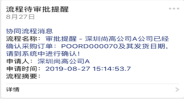 啟用采購協(xié)同管理的供應(yīng)商通過微信接收到同步的采購訂單信息后,對所屬的采購訂單確認(rèn)后進(jìn)行發(fā)貨。全程高效協(xié)同,實現(xiàn)有計劃的集中采購(微信端接收信息與處理)。